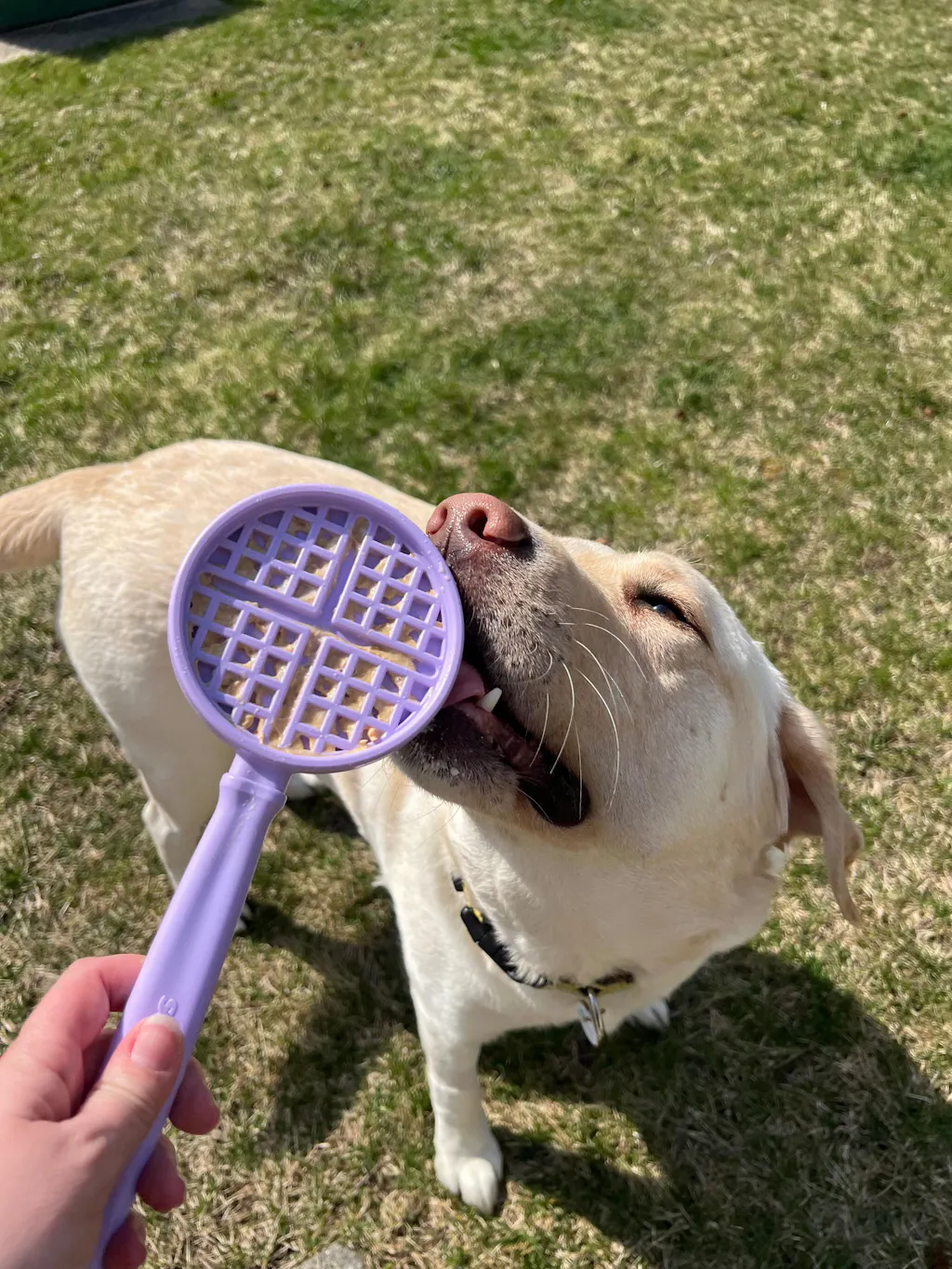 Spread your dog's favorite soft treat onto the textured surface of the Lick Stick. Hold the handle while your dog licks the treat, or freeze it for 2-3 hours for a longer-lasting enrichment session. The textured surface makes treats last longer while providing calming licking activity. Perfect for distracting dogs during nail trims, brushing, or other potentially stressful situations as well as during training.